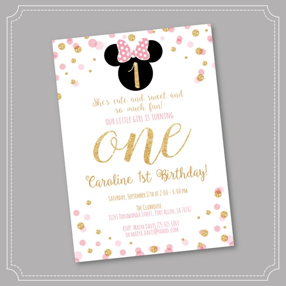 Minnie Mouse, Pink, Gold, Baby Shower Invitation | eBay from i.ebayimg.com Minnie mouse birthday invitation, minnie pink and gold rating required select rating 1 star (worst) 2 stars 3 stars (average) 4 stars 5 stars (best) name Editable pink & gold minnie mouse invitation, gold glitter floral, baby pink birthday invitation, birthday invitation instant download mmlpg theprintableoccasion 5 out of 5 stars (8,720) sale price $6.99 $ 6.99 $ 9.99 original price $9.99 (30% off. Free minnie mouse pink and gold invitation templates. Pink and gold minnie mouse 1st birthday invitation, first birthday invite, girls polk dots, gold glitter, editable templates intant download $7.99 pink floral 2nd birthday invitation, flower watercolor invitate, pink and gold girls invitations, editable invite, template instant download If other than second birthday, the top would say oh toodles invitation is Pink and gold sweet 16 birthday party invitations with envelopes. Minnie mouse 2nd birthday invitations template. It looks at the large blank space and the stripped frame pattern.