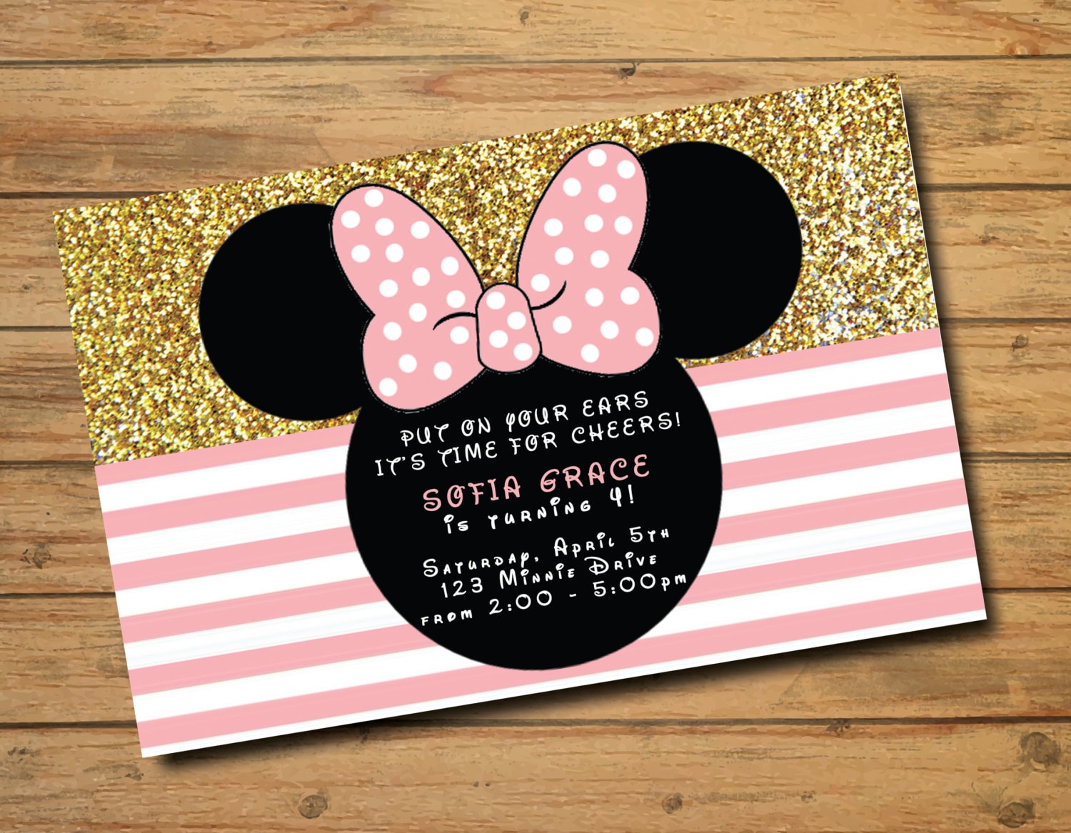 Previous post free printable shuttle space birthday invitation templates There are also three eclipse shape in pale pink, blossom pink, and the last one, even has gold glitter texture in it. Editable minnie mouse pink and gold invitations, first birthday light pink invitations, baby pink instant download, gold glitter printable theprintableoccasion. On this edition, the colors are gold and pink which would make the pictures glamorous and excellent. Minnie mouse birthday invitation, minnie pink and gold rating required select rating 1 star (worst) 2 stars 3 stars (average) 4 stars 5 stars (best) name